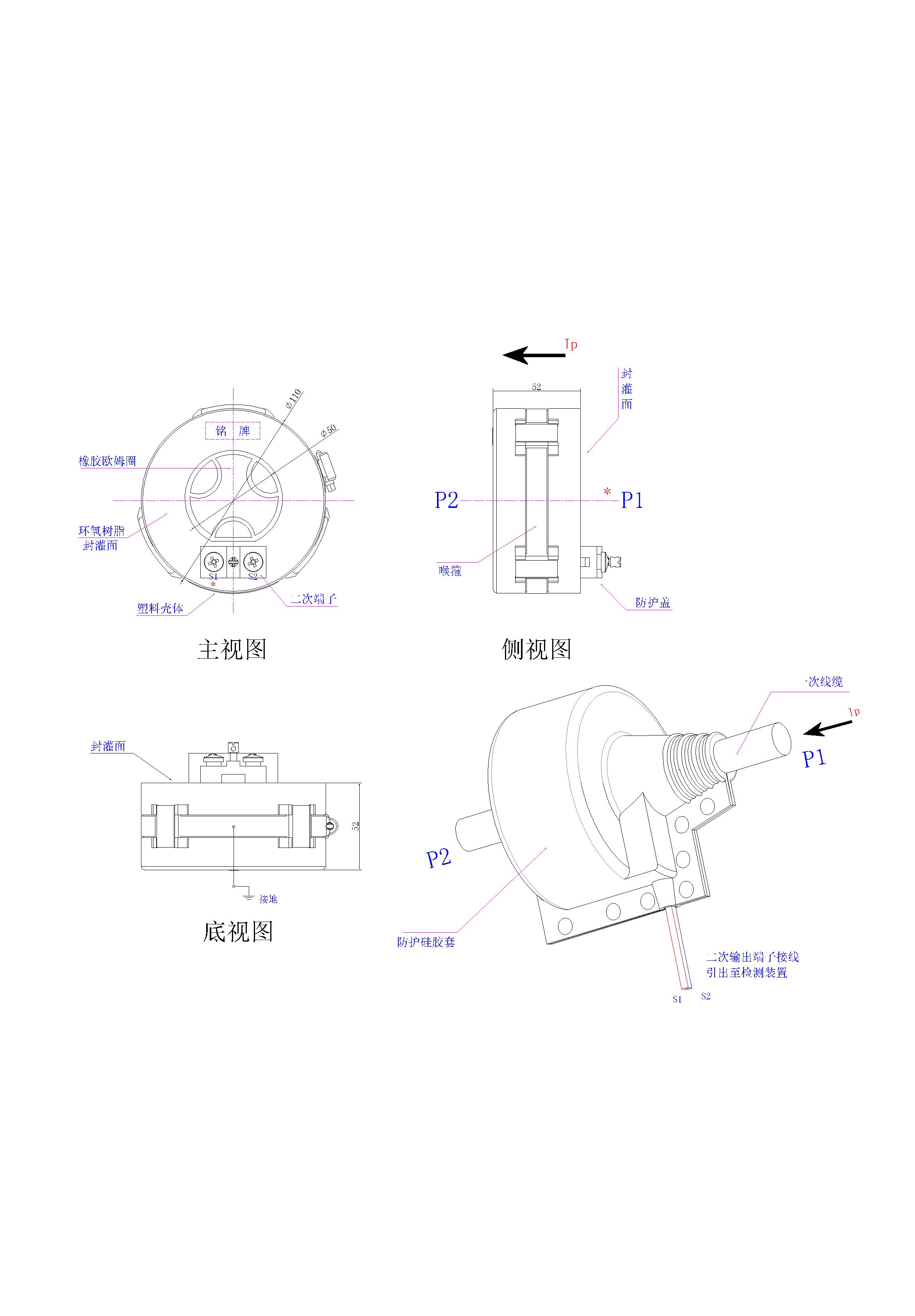 极性同名端 封灌面“P1”与接线端子“S1”为同名端极性关系(减极性)
